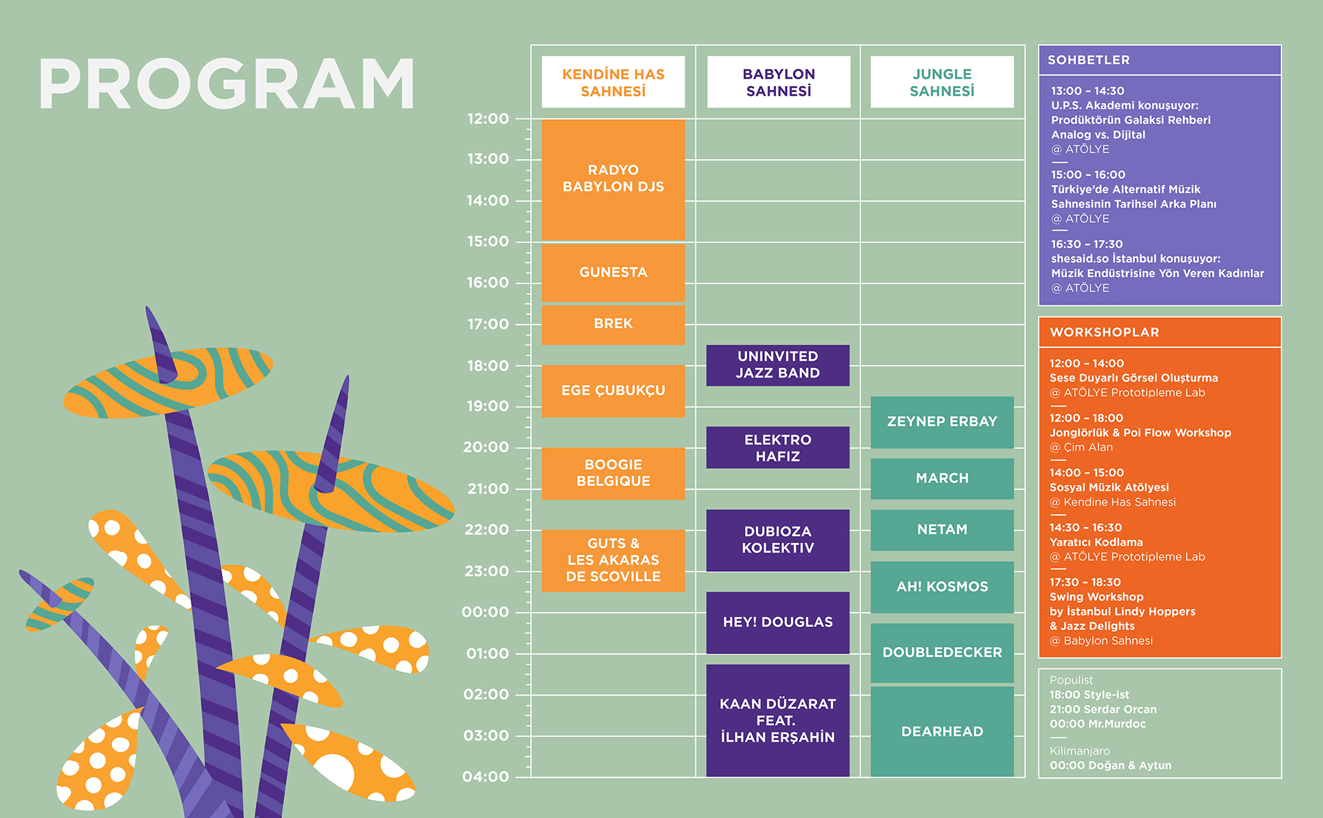 GUTS & Les Akaras de Scoville, Dubioza Kolektiv, Kaan Düzarat feat. İlhan Erşahin, Boogie Belgique, Ege Çubukçu, Hey! Douglas, Ah! Kosmos, Elektro Hafız, doubledecker, DearHead, BREK, Netam, MARCH, Zeynep Erbay, Gunesta, Uninvited Jazz Band, Radyo Babylon DJ’s, DJ Style-ist, Serdar Orcan and Mr.Murdoc will be performing on three different stages – Kendine Has Stage, Babylon Stage, and Jungle Stage, at the Kendine Has Babylon Soundgarden 2019. Kendine Has Babylon Soundgarden 2019 also offers talks and creative activities beyond music.